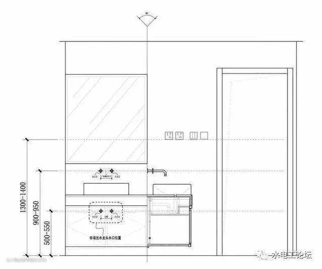 4、洗脸台盆处要预留两个插座(吹风机、消毒牙刷架),高度与开关一水平1300-1400㎜。