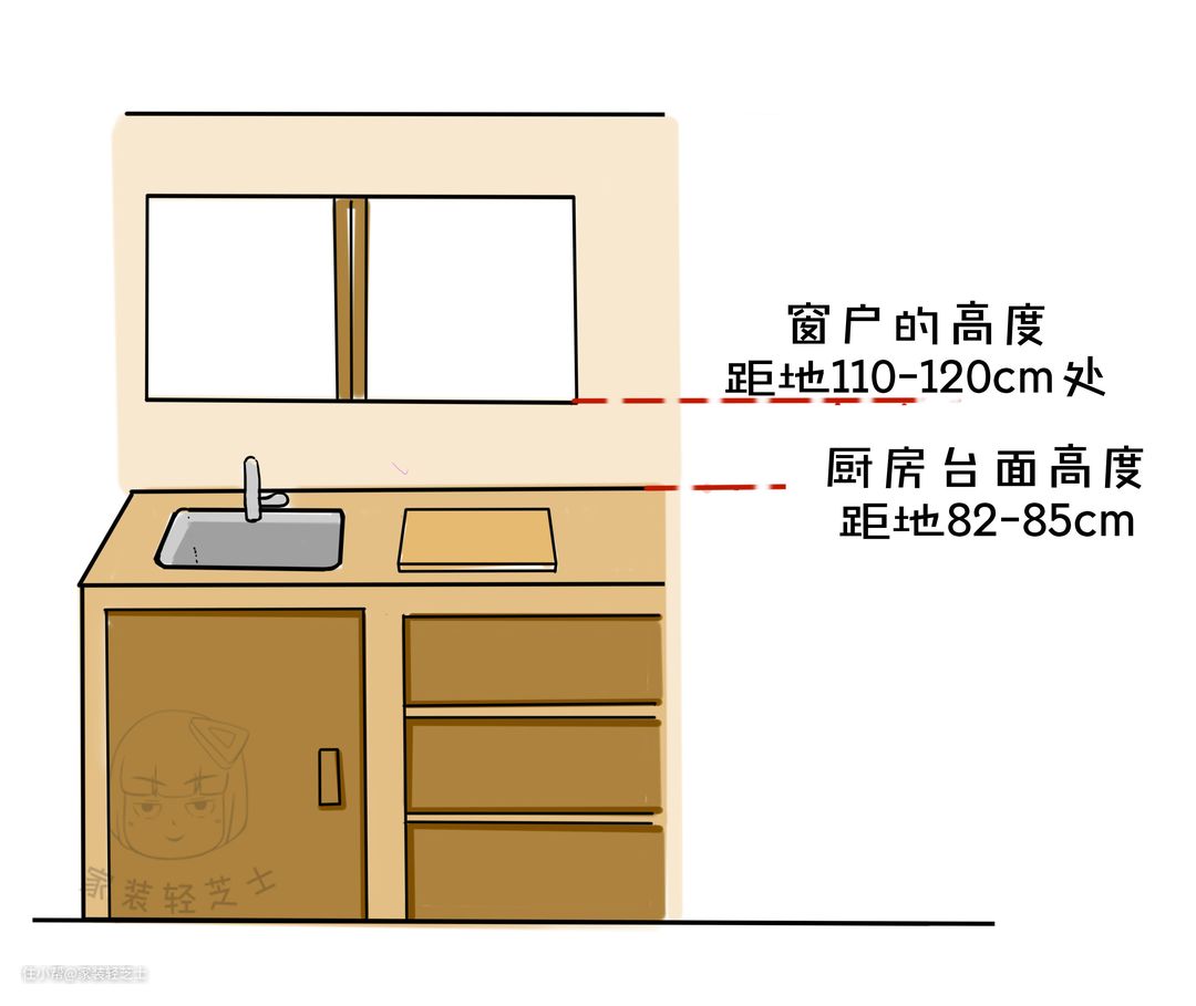 厨房台面高度距地82-85CM所以窗户要据地110-120CM处,才不会遮挡视野,顺便挡住凌乱的台面。