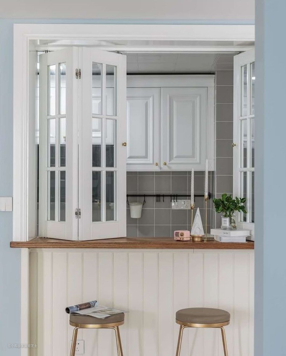 厨房也是个适合打造室内窗的地方,可以让厨房变成半开放式。