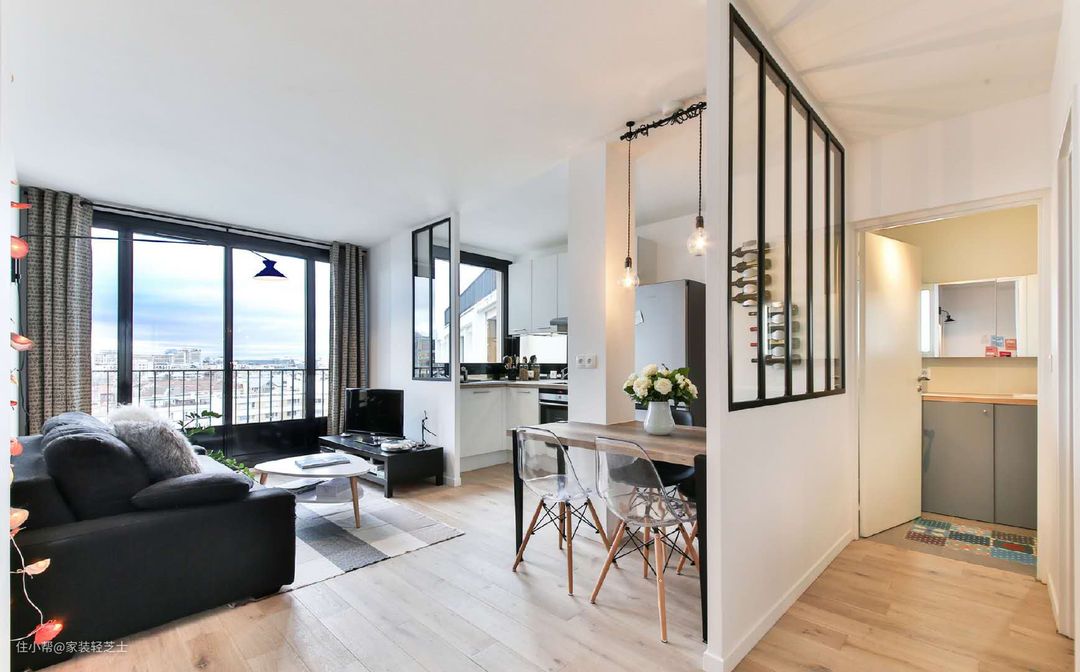 室内窗还能用来改善暗卫采光,比如在这个案例中,原暗卫没有采光,于是砸墙借光,在客餐厅和暗卫之间打造一面室内窗!