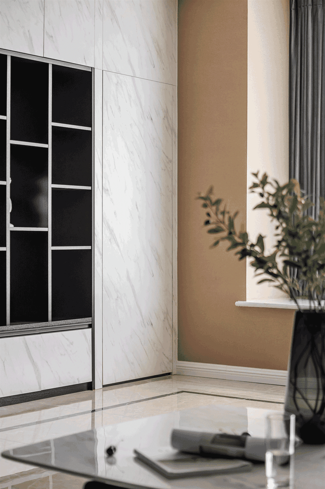 饰面纸贴覆无造型的木门,门板表面全平,结合整体效果具有“隐形”效果。相比浮雕门,线条更加简约大方更具质感。