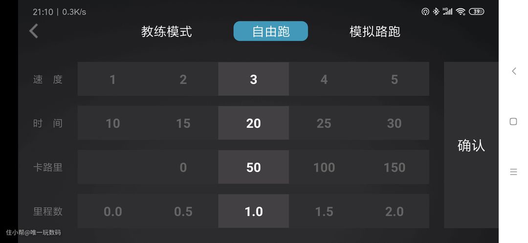 自由跑则更加适合专业的跑步手,可以自己调节速度,时间和卡路里以及里程数的参数和目标,然后跑步机就会根据你设定的参数给出适当的跑步速度。