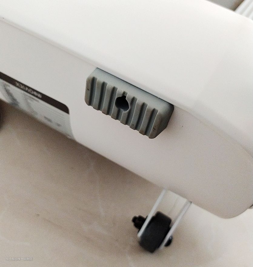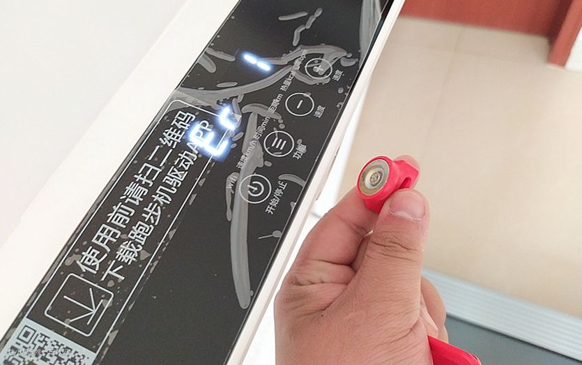 开关键的下方有一个圆形红色的安全锁插槽,正常情况下需要附带红色的安全锁才能正常开机。安全锁为磁吸式设计,拿下安全锁后,跑步机会停止跑版转动,这样设计的目的是为了防止用户在正常使用时跌倒,只要拉下安全锁后即可让跑步机停下。