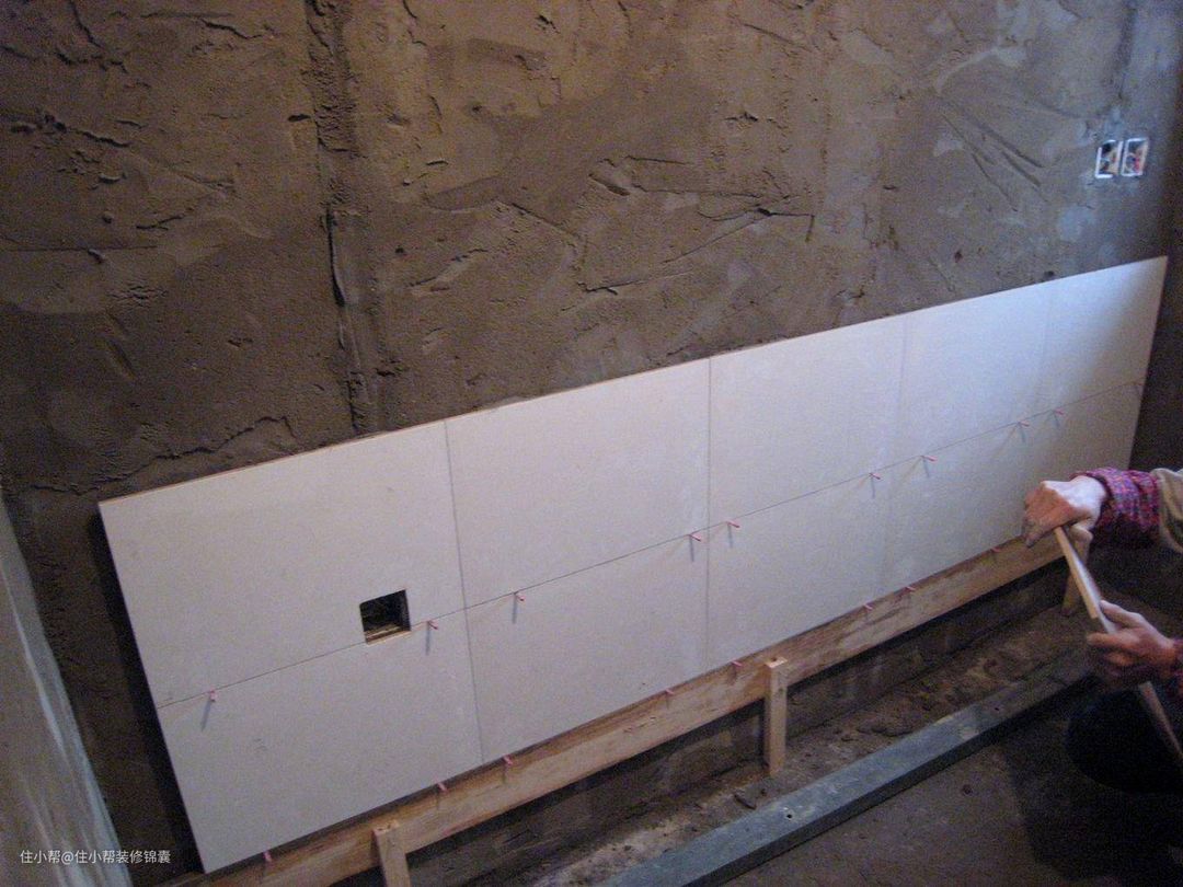 而且墙砖压地砖也比较节省时间。墙砖压地砖对缝隙的处理会比较容易。最后贴留下的那一排墙砖,操作比较方便,即便缝隙不太均匀。由于位于最下方,也不会看出来。