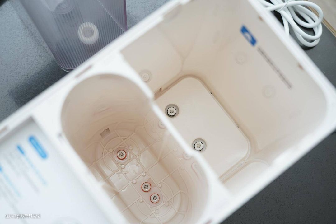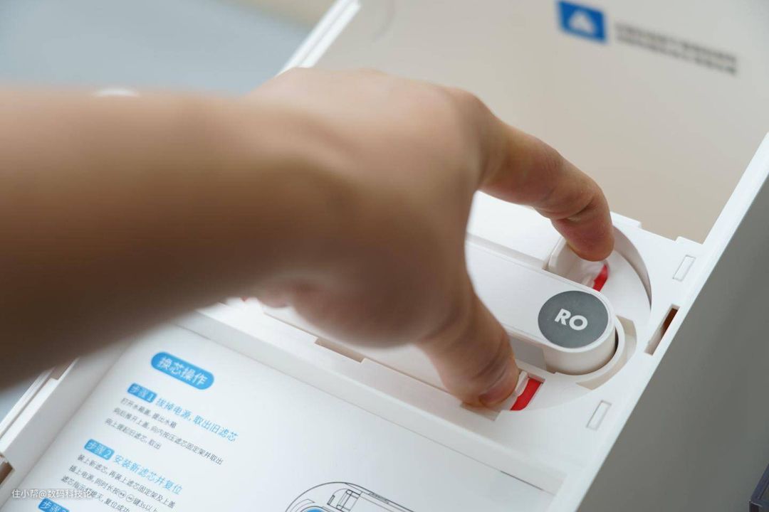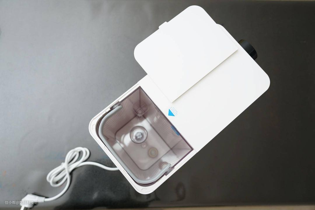 水箱在机身后半部分,顶盖直接揭开即可看到。取出也比较方便,有厚实的提手设计,不过由于本身机身高度38cm、水箱也接近这个高度。所以这个净水器不太适合放置在超过1m的橱柜或者桌面上,不然审稿较矮小的老人取水箱加水不是很方便。