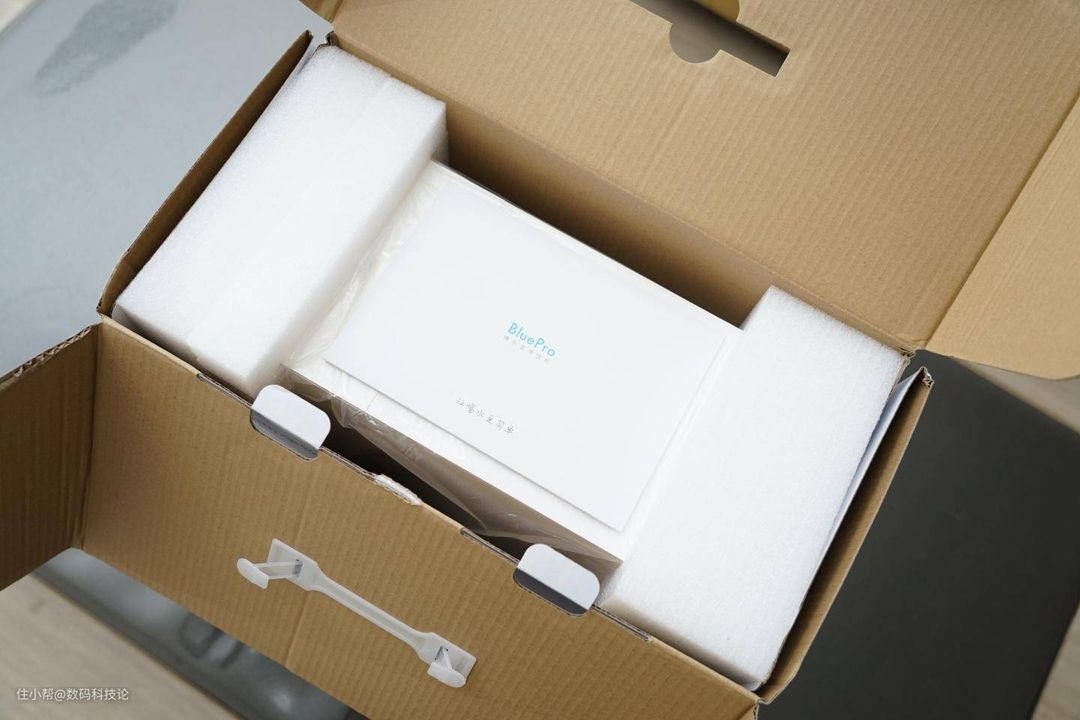 BluePro 博乐宝B16即热净饮机由于集成了储水、过滤、加热、智能控制等功能,并搭载了5L大容量水箱,所以整机至有分量,含包装重量达11KG。好在包装给力、双层纸箱、加强泡沫支撑,在长途跋涉的运算中也没有发生可能等情况。