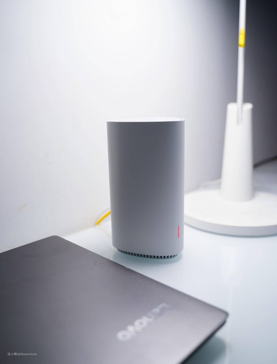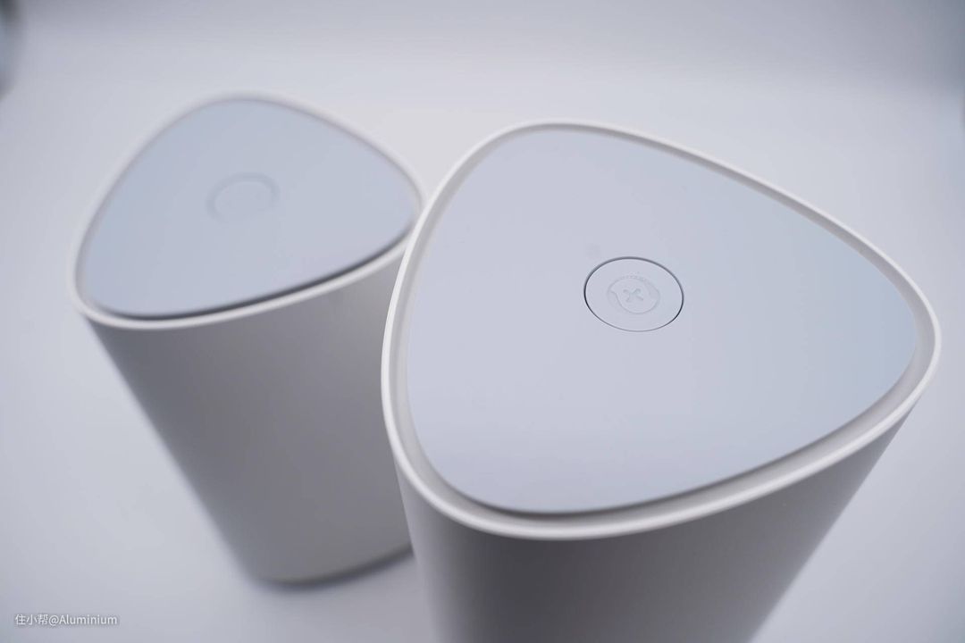 路由器是三角柱体的造型,边缘做了圆润化的处理,看着也是挺可爱。白色的简约设计风格,让子母路由在家中的摆放不会显得那么突兀,也不会影响原本家中的装修风格。