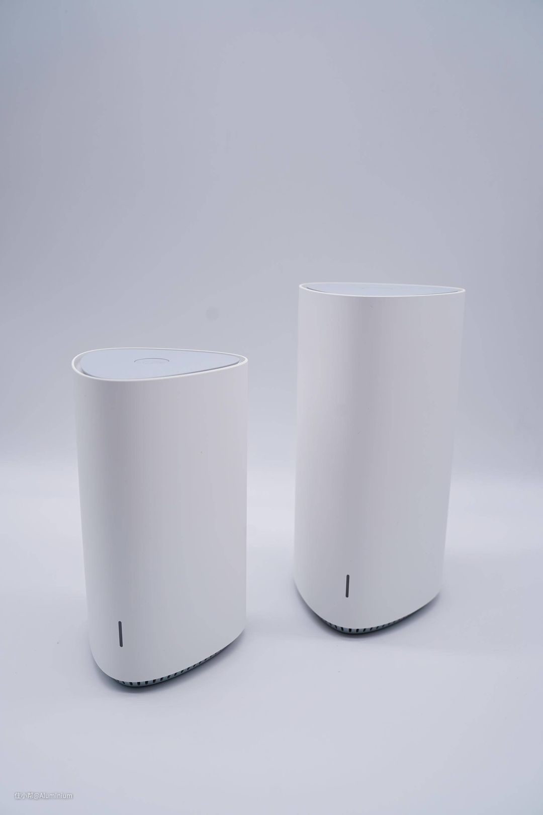 内部一共两台设备,一大一小,一个作为主路由提供mesh controller的能力,另一个作为副路由,提供mesh agent的能力。外观以白色为主,上盖和下底为灰色,看着比较简约和清爽,中底附近一个指示灯,红绿二色可显,用于指示组网是否成功。