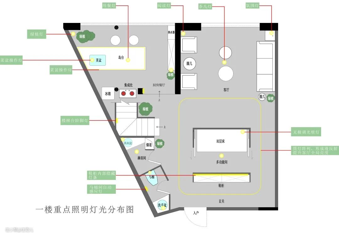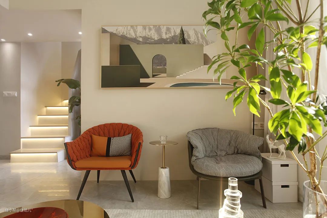 相比大开间的采光优秀,如果是采光不足的复式空间,除了刷浅色墙漆有扩大视觉空间的效果外,一定要利用好灯光优势。