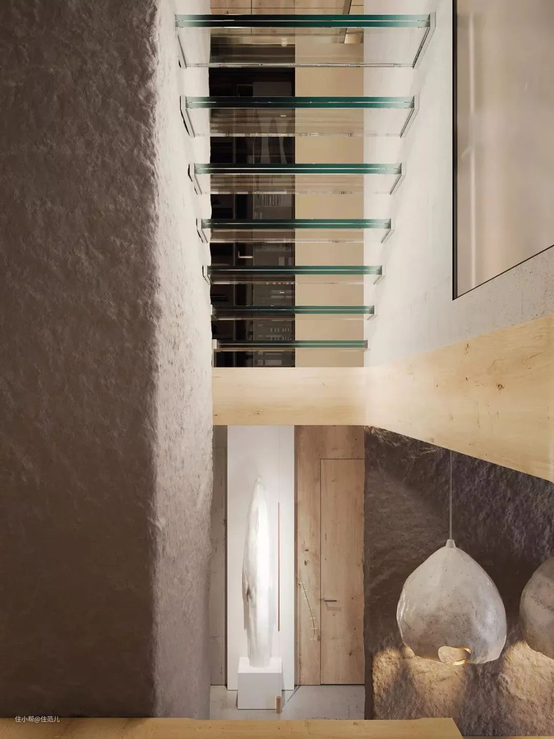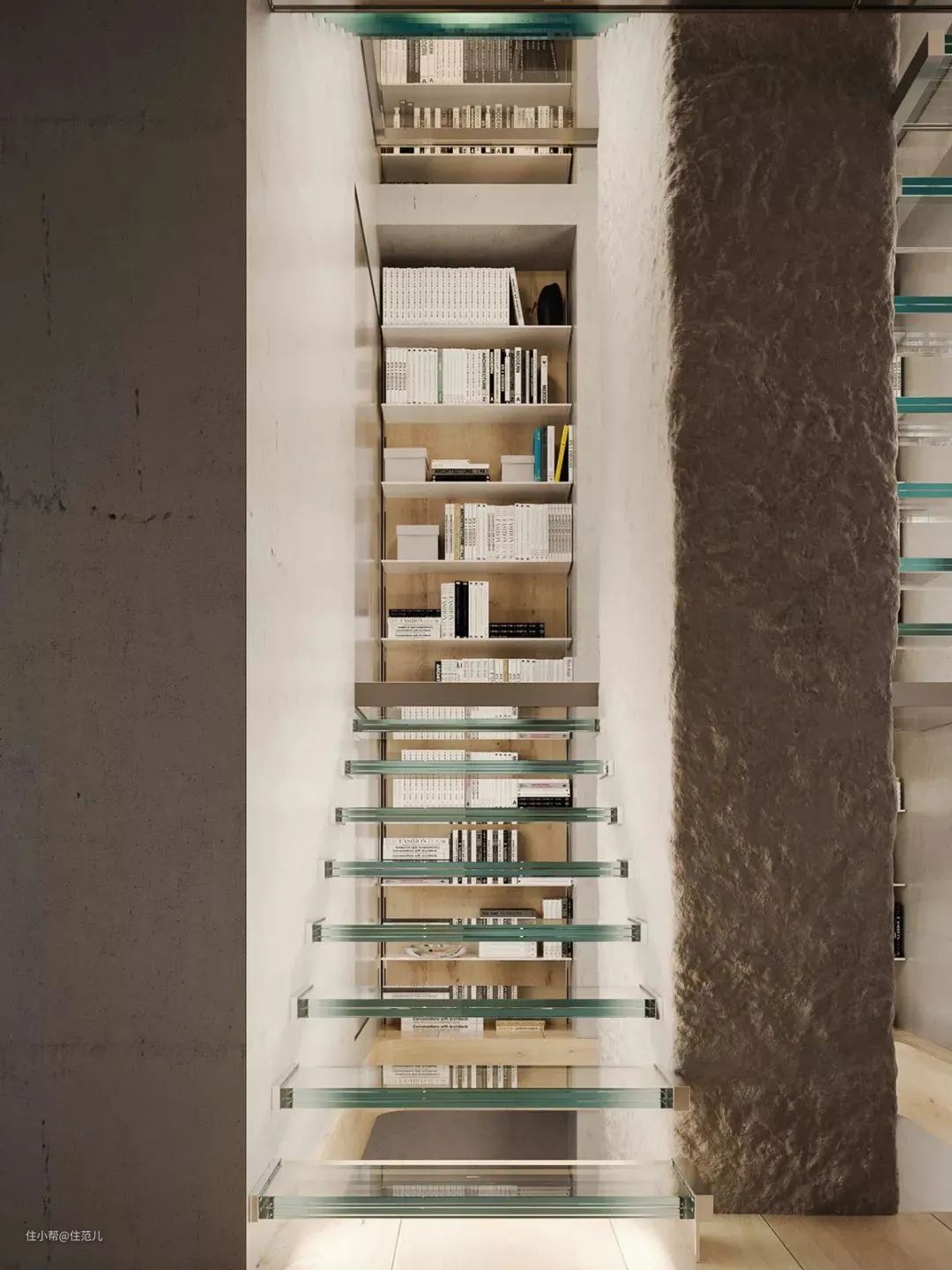 衔接二层楼不同材质造型的楼梯设计,不仅可以储物,还能成为家里的简易艺术长廊。