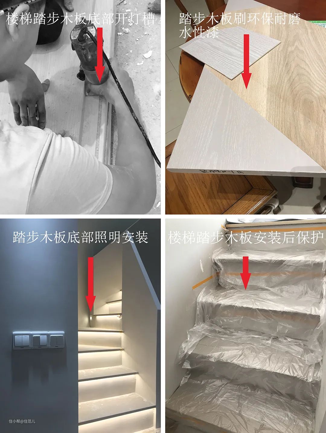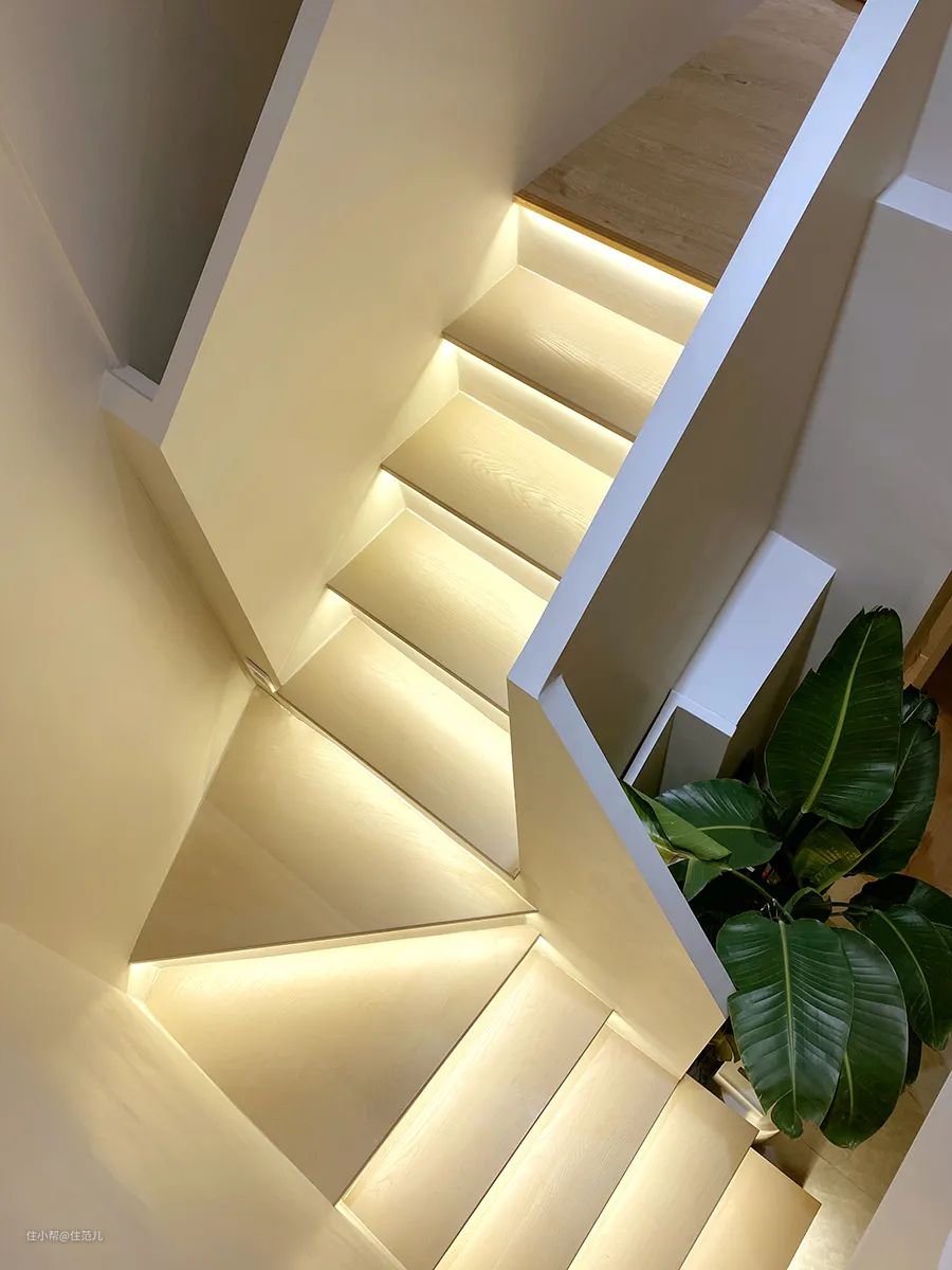 对于有楼梯的复式空间,每步台阶都装上Led暖白灯带,上下楼时见光不见灯。
