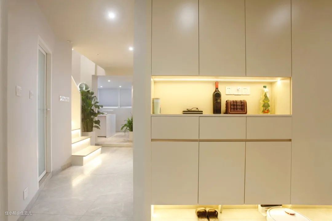 无自然采光的入户区,玄关柜中间壁龛凹槽和底部放鞋区都可以装设Led灯带,拿取东西照起来也相当方便。