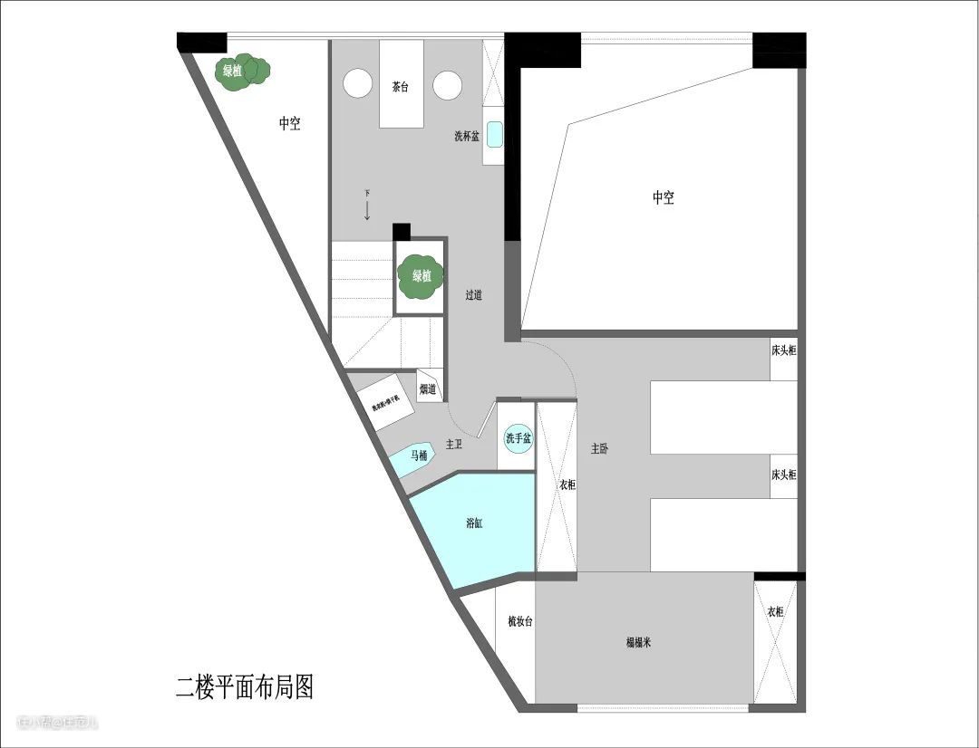 这里插播一下另外两个栗子,二楼的卧室区也都是主卧不到顶的矮墙,借入客厅大部分采光,增强白天的亮度。