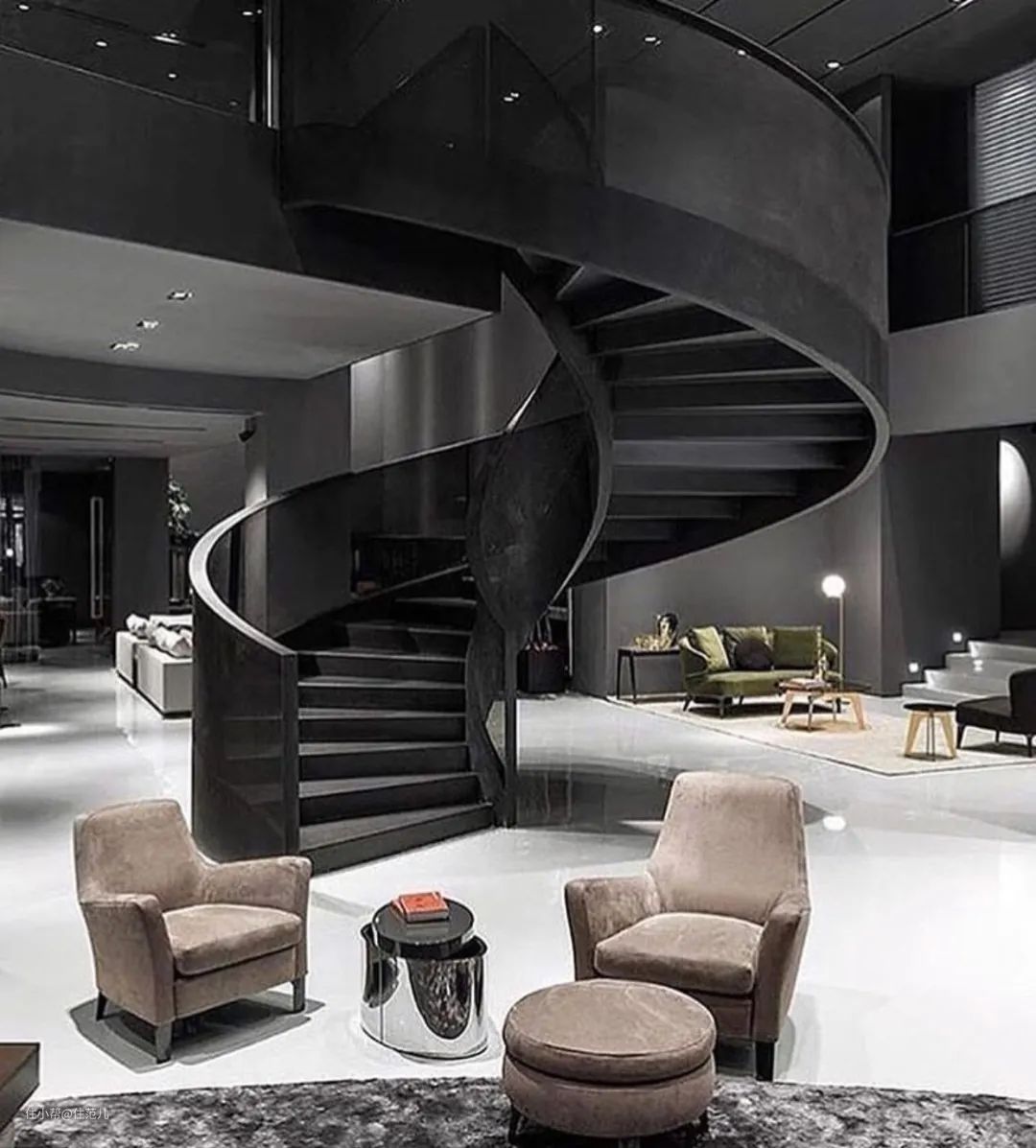 旋转楼梯,占地面积小,结构多采用钢结构,承重好但是楼梯下没有可利用的收纳空间。