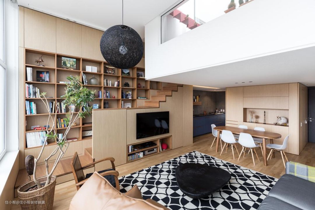 充分利用直梯和折梯下方的空间,可以定制一个收纳柜,增加收纳空间;或直接摆上桌椅,当成休闲区使用。