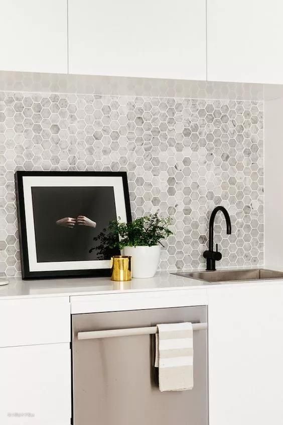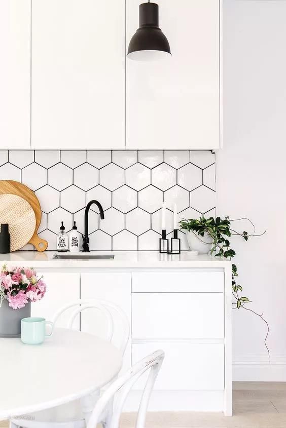 这种像蜂巢一样的六边形瓷砖近年来也很流行,颠覆传统横平竖直,带有一种活泼俏皮风,很适合在厨房铺。
