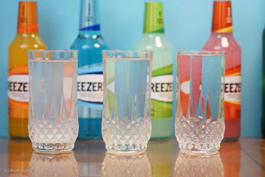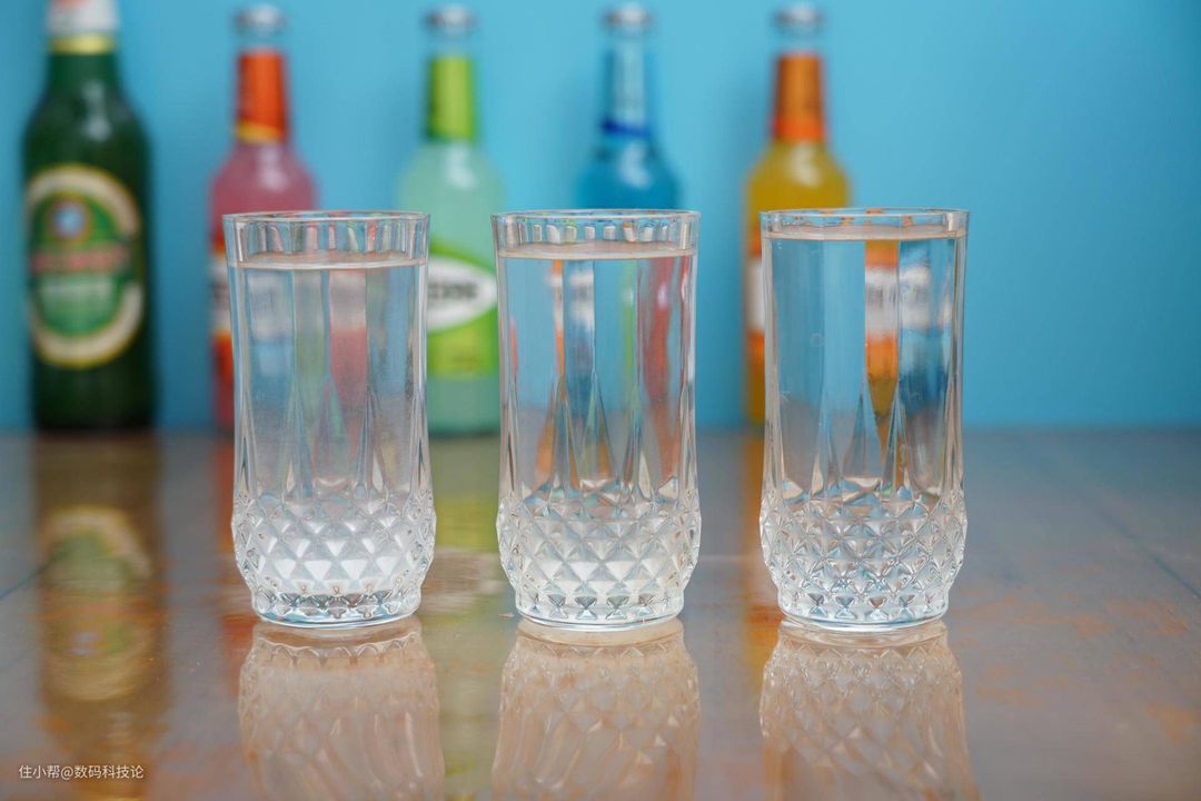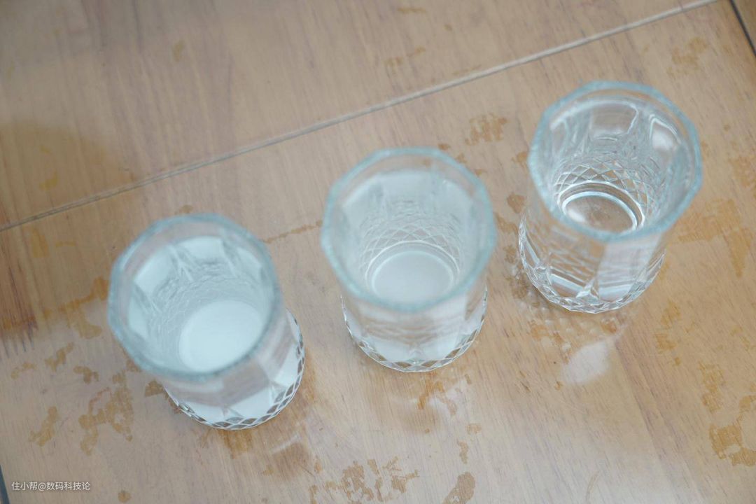 后来我把三杯水放在桌面上静置1小时,模拟普通水壶加热以后沉淀的过程。结果发现尽管自来水经过沉淀后有所改善,但与BluePro 博乐宝B16即热净饮机的清澈度还是有很大差别的。下面从左到右依次是:废水、自来水、B16过滤的水: