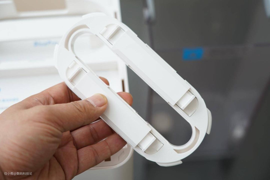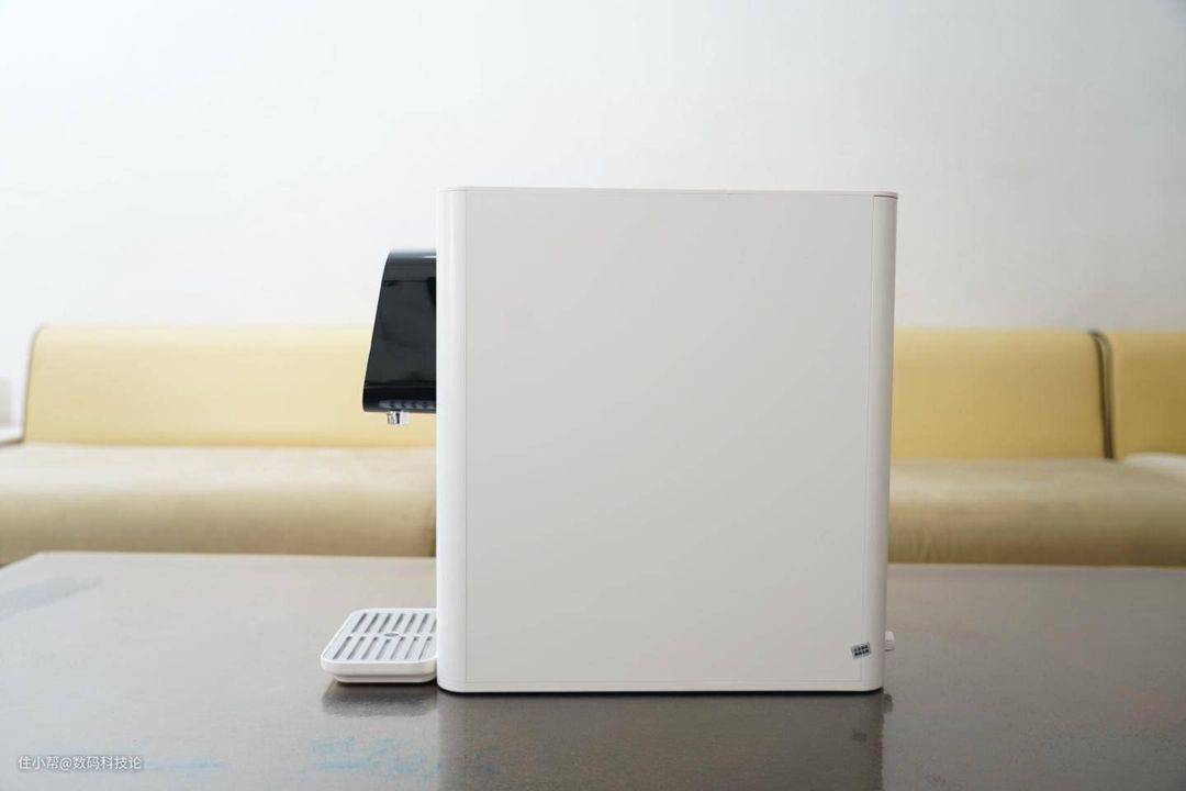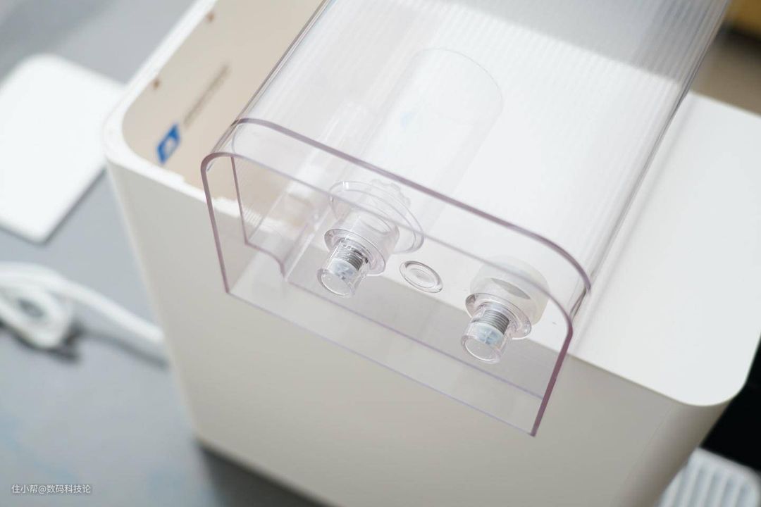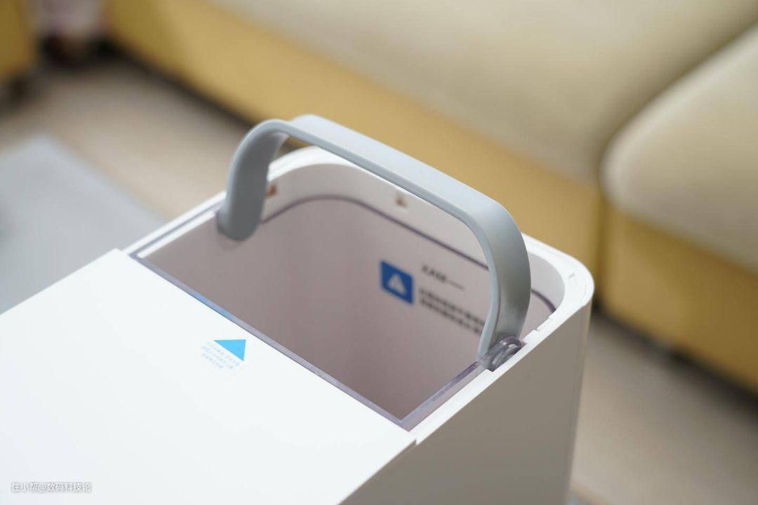 水箱在机身后半部分,顶盖直接揭开即可看到。取出也比较方便,有厚实的提手设计,不过由于本身机身高度38cm、水箱也接近这个高度。所以这个净水器不太适合放置在超过1m的橱柜或者桌面上,不然审稿较矮小的老人取水箱加水不是很方便。