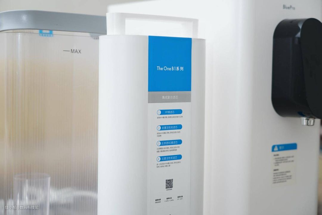 BluePro 博乐宝B16即热净饮机的滤芯为集成复合滤芯,包括PP棉、前置活性炭、范生态RO膜、后置活性炭等四层过滤结构。PP棉主要过滤水中悬浮物、铁锈等大颗粒;前置活性炭和后置活性炭主要是去除水中余氯、异味、异色以及有机污染物。反渗透RO膜过滤精度达0.0001微米,也就是0.1纳米,可以过滤水中的细菌、重金属离子等等。