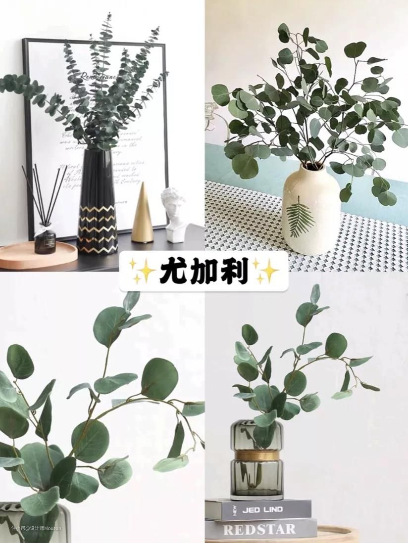 ③尤加利:因叶茎纤细,显得简雅、冷清,会给人营造一种轻盈、空灵的感觉。而它的叶色是设计师们会喜爱的高级灰绿色,还带有一层白霜,镜头感及观赏性极强。