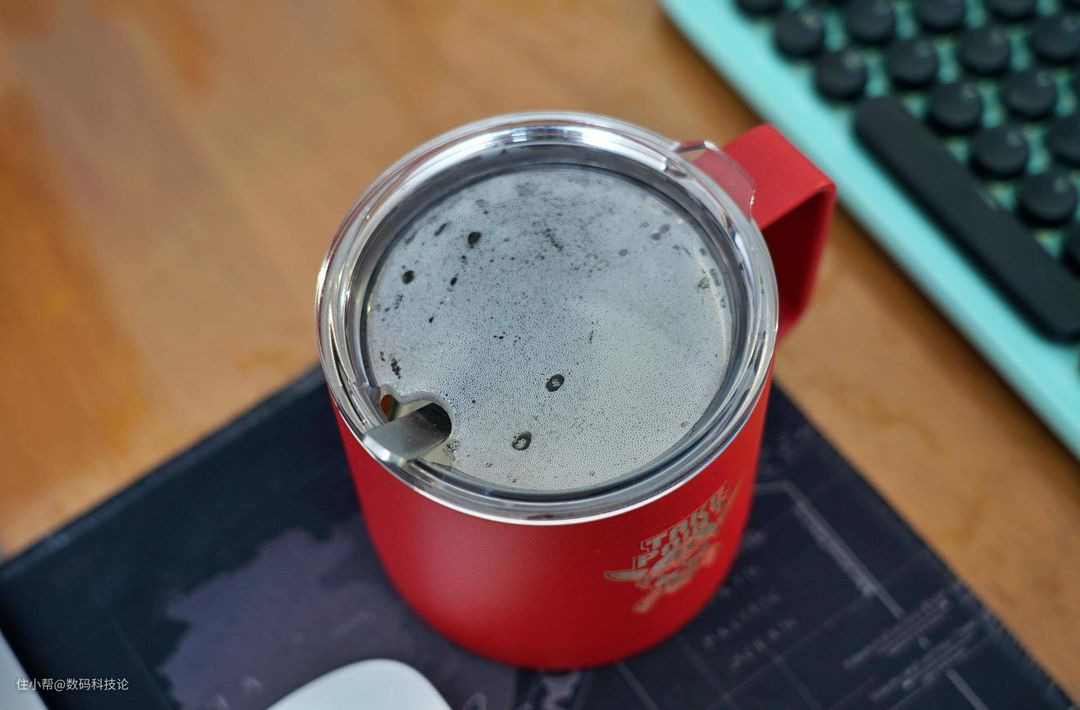 下面是盖子的特写,密封圈很紧,内外双层真空结构,有一定的保温性,不过由于杯盖单层设计所以保温性没有旅行杯好。