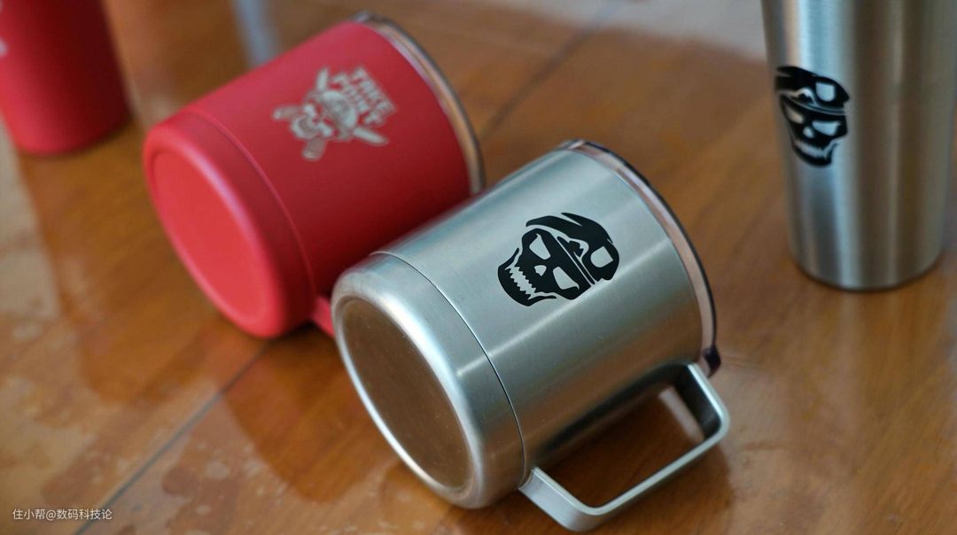 而从杯子底部来看,两个都是用带骷髅图腾的不锈钢片封堵了抽真空的孔,扣过来看也有看点。