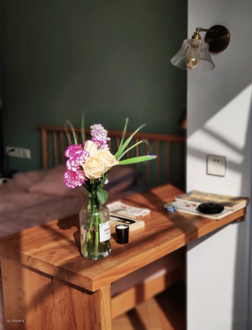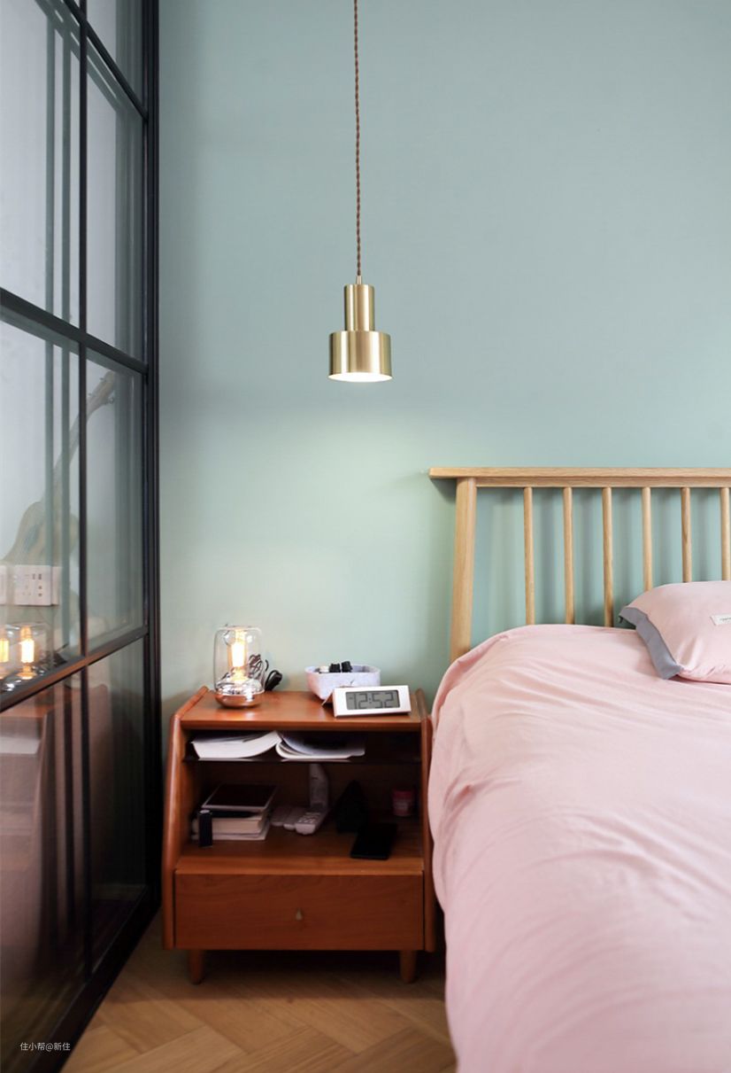 对于爱看书的人来说,卧室床头柜少不了,二黑木作的床头柜和墙面的尤加利绿以及黄铜的灯显得十分和谐。