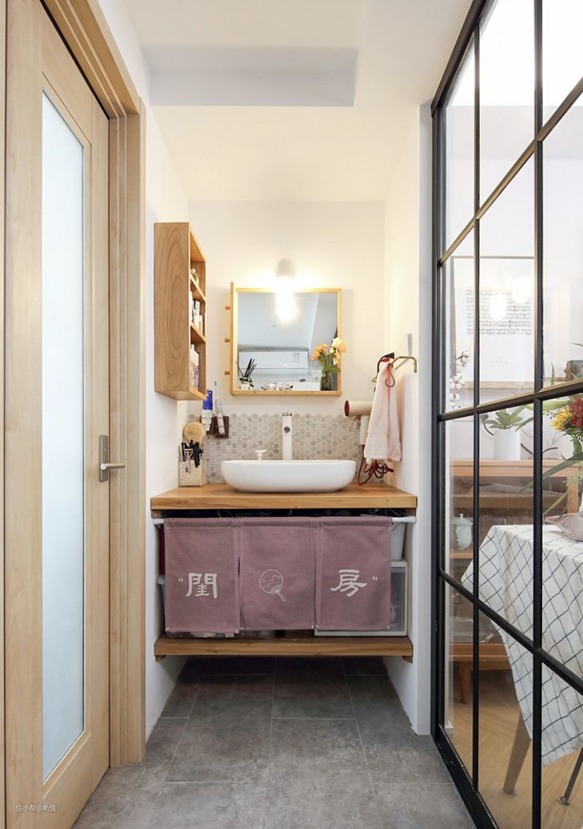 卫生间在规划之初就做了干湿分离,干区是好看的台上盆+小方镜,用老榆木做台面,怕下面看起来凌乱,还用伸缩杆和小帘子做了遮挡。左边墙面壁挂了一个开放格,变成了Natalieee的梳妆台。