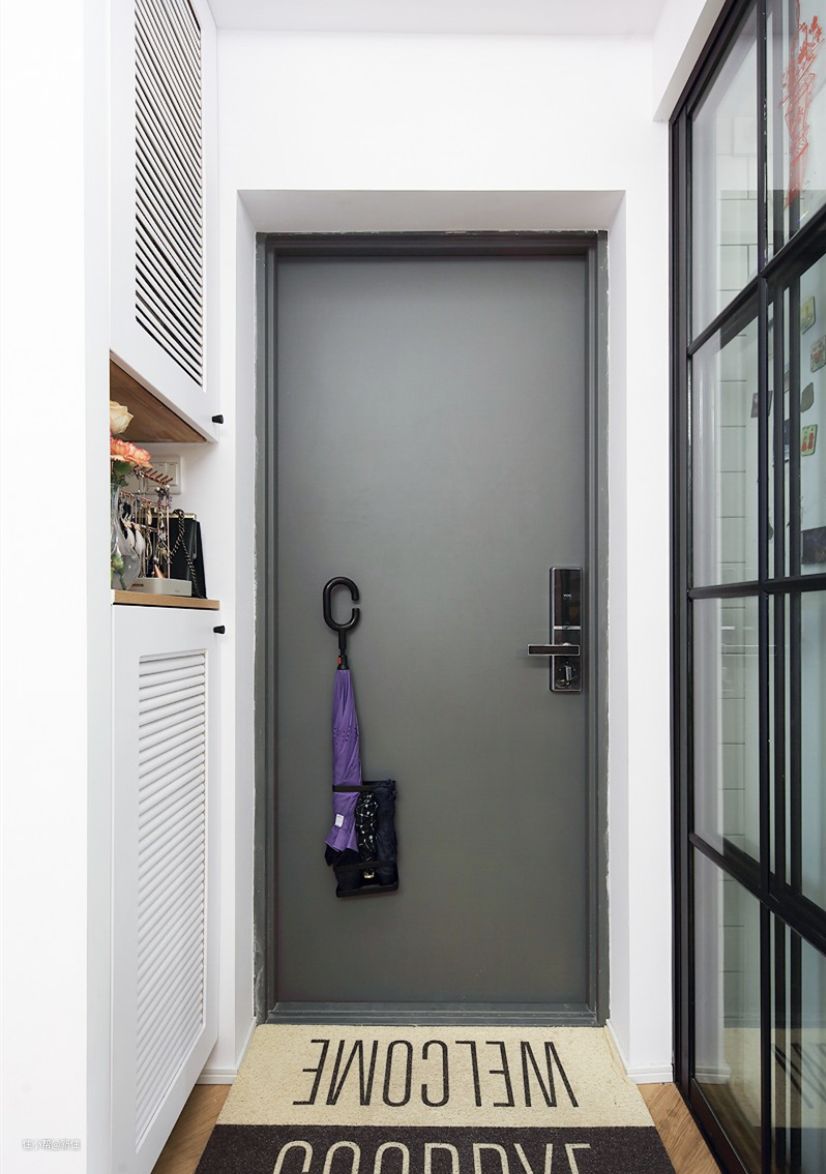 常见的很多入户门门都是猪肝红,土气不说,还让室内和玄关风格突变,Natalieee的家的门用的水泥色,低调简洁,和室内大块的白色区域非常和谐。