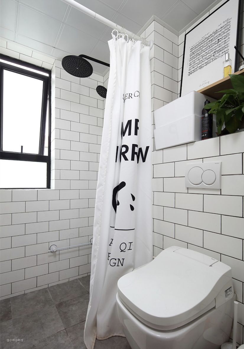 卫生间湿区是淋浴和如厕的地方,壁挂马桶因为入墙排水,正好留出一个台面空间作为收纳。黑色花洒、小白砖、灰色地砖、白色浴帘,黑白灰搭配把卫生间湿区打造得非常清爽。