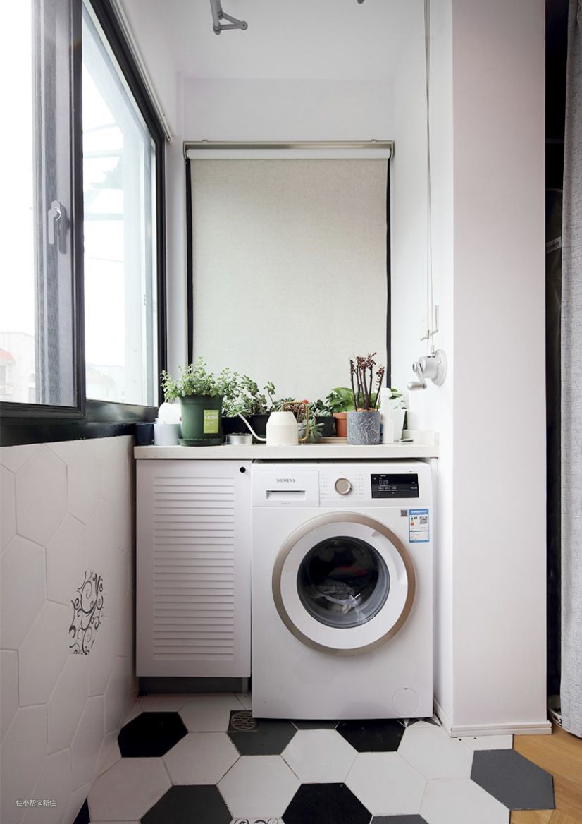 阳台另一侧是洗衣机+绿植区,最外侧的小柜子正好来收纳洗衣用品和养花的工具。