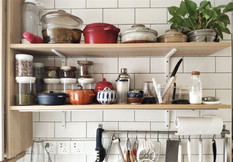 除了吊柜和橱柜外,水槽上面还用隔板收纳常用的锅以及谷物类,拿取方便很多。厨房的很多常用物品都放在了伸手可取的位置,甚至还安装了空调,对爱做饭的女生来说,真的满满幸福感。