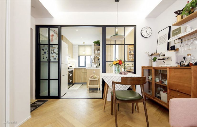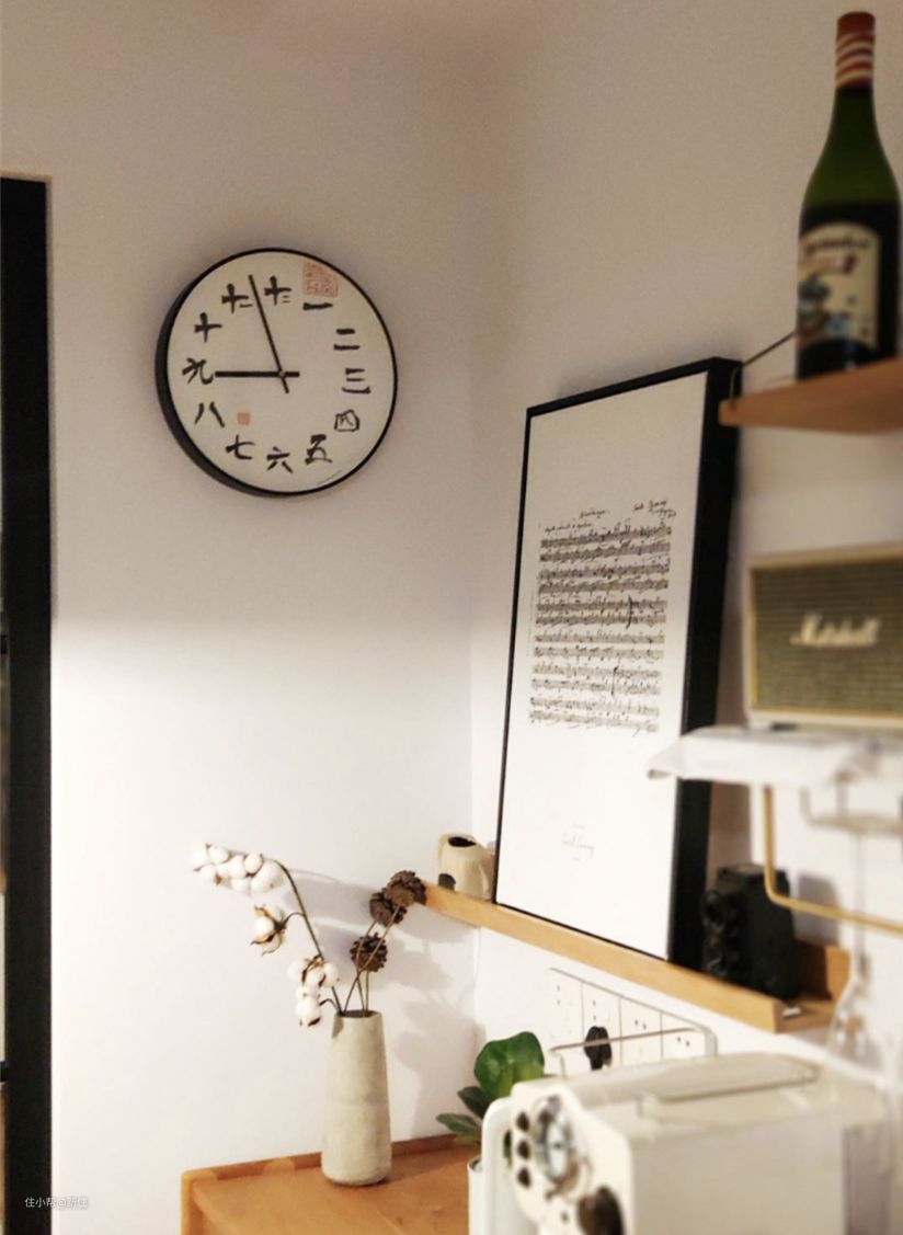 餐厅侧面墙上,还挂了一个大写数字的时钟,非常有特色,仔细看可以发现,Natalieee家的主要色彩搭配还是黑白为主,而调色的如深绿、裸粉、以及木质桌椅地板的颜色做了中和,整体减少了清冷单调的感觉。