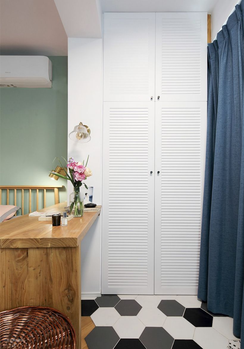 本来没有玄关,改造后客厅变大,也多出了一个储物间,于是打了一个顶天立地的鞋柜充当入户玄关。用的是百叶窗样式的柜门,减少小户型的压抑感。Natalieee还特别注意了鞋柜内部的隔板间隔,按照自己的鞋高定制,小细节处可见对生活的认真。