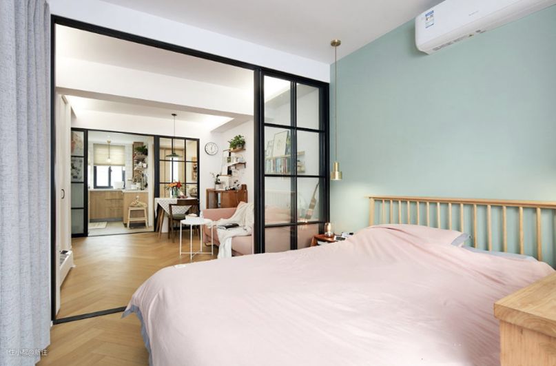 卧室和客厅用三联动移门代替了厚重的墙面做分隔,即便是坐在床上也可以看到客厅的电视和餐厅的时钟,这就是玻璃移门的方便之处吧!