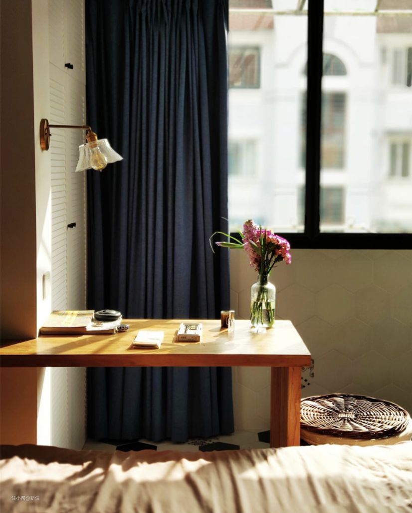 卧室与阳台间用的一个书桌做间隔,方便偶尔加班和写字,同时也是作为卧室和阳台的区域划分。