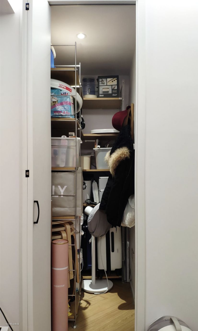 装两面移门,打开里面已经被各种物品填满,风扇、行李箱、以及各种电器说明书等等,一个大高置物架,让整个空间成为家里最充实的地方。