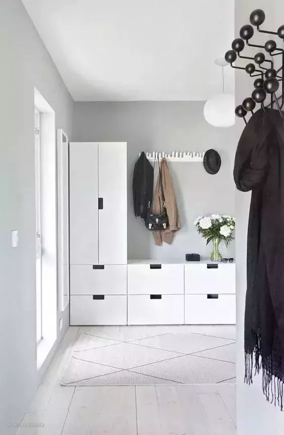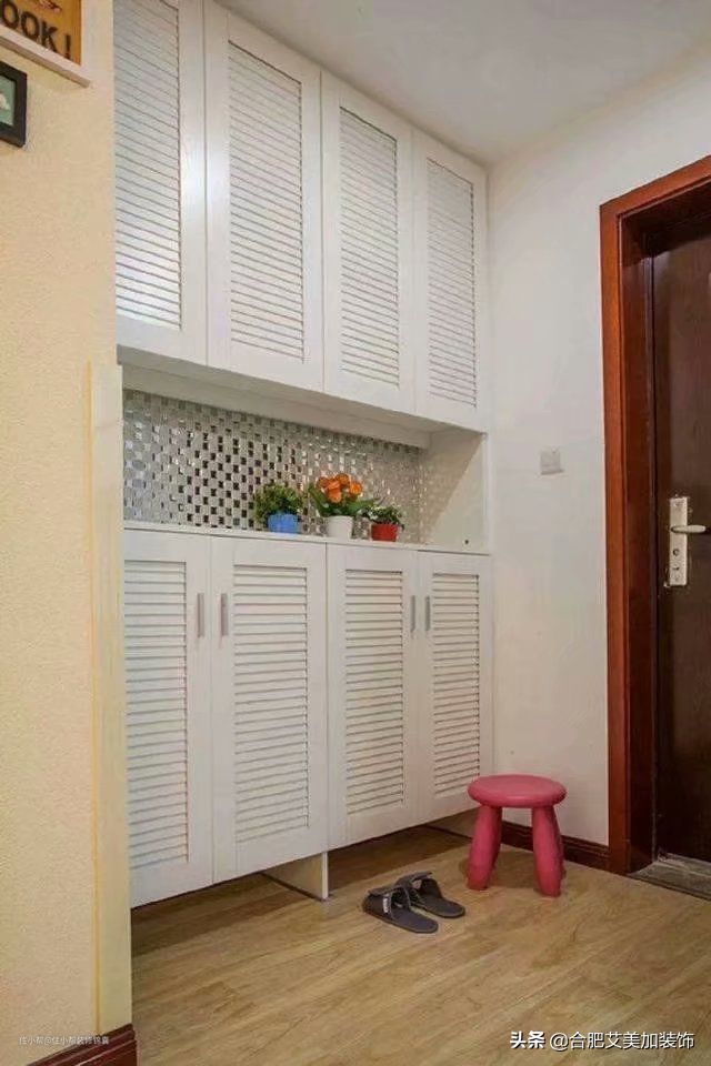 将鞋柜做成百叶门。百叶门类似于我们熟悉的百叶窗,表面有一格一格的空隙,既能遮挡东西,同时也很好的解决了不透气的问题。