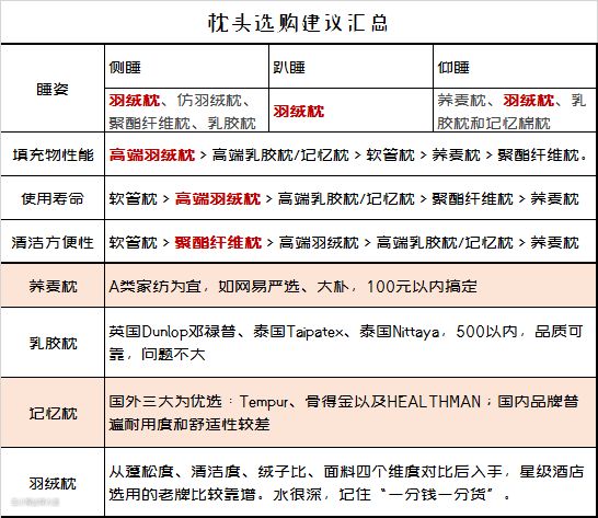 我们买枕头首先买的就是舒服和健康,只要能达到这个需求,其实价格无所谓。如果你睡眠没问题,睡姿没问题,脊柱颈椎没问题的话,枕头可以随便选,只要舒服就好。但是如果你有以上任何一点的问题,可能就要在选择购买枕头的时候好好考虑下了,关于不同枕头的优劣势及选购要点已经在下面两张图上列明了,大家按需购买就行了。