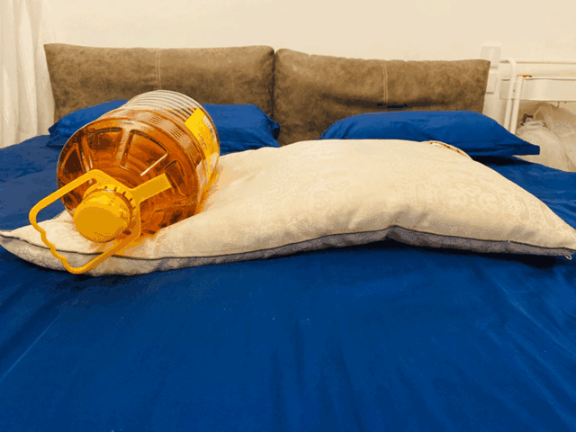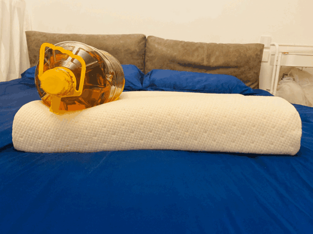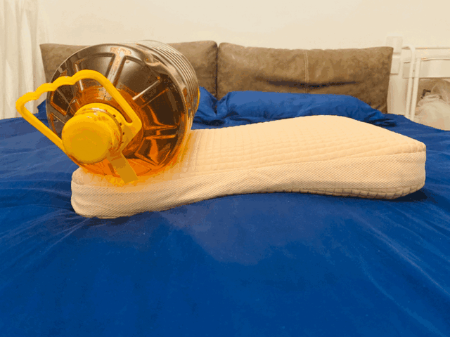成年人头部的重量约4.5-5.5kg,我选了一个5.4L装的花生油来大致模拟睡眠时枕头的受力状态,看看枕头的支撑性如何。