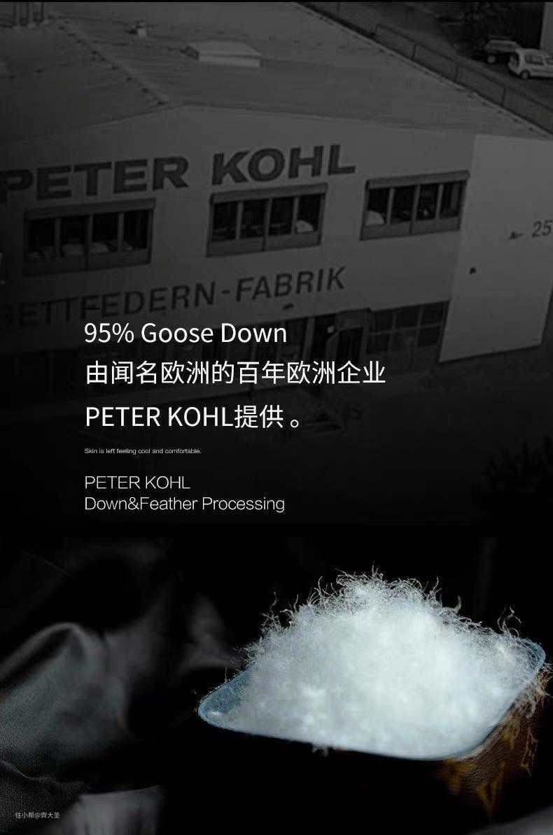 这款枕头填充物为95%大朵白鹅绒,供货商为拥有百年历史的Peter Kohl,选材可以说非常考究了,也是按照顶级羽绒枕标准进行选用。