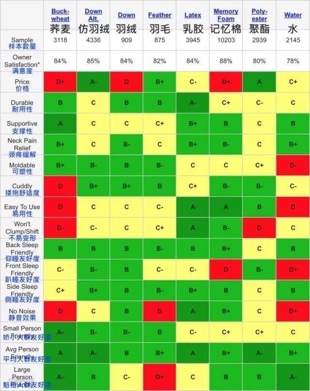 前文也说过,枕头舒服与否是一个很主观的感受,很难定量评价。因此国外评测网站Sleep Like the Dead通过搜集样本量,获得不同种类枕头在不同维度的用户体验得出下表,应该具有比较客观的参考性。