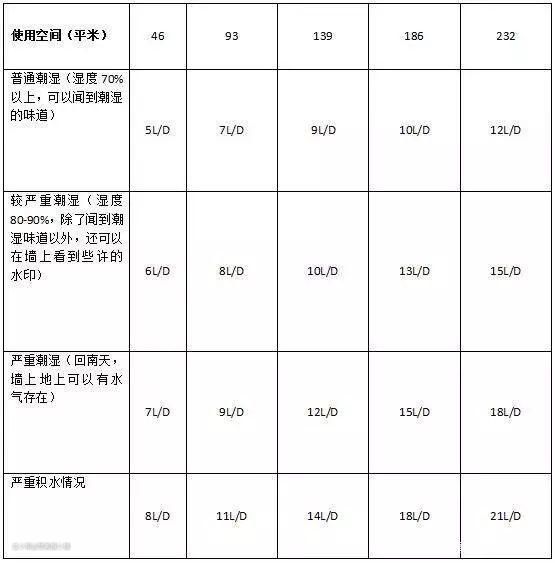 ▲对于除湿机的选择,我们可以借鉴美国的AHAM标准,该标准列明了在5种空间大小和4种环境潮湿严重程度下所匹配的除湿量大小。从上表中可以看到,对于大部分家庭而言选择12L/D参数的抽湿机,基本就可以满足屋内的抽湿需求了,而这也是目前抽湿机的主流机型参数。