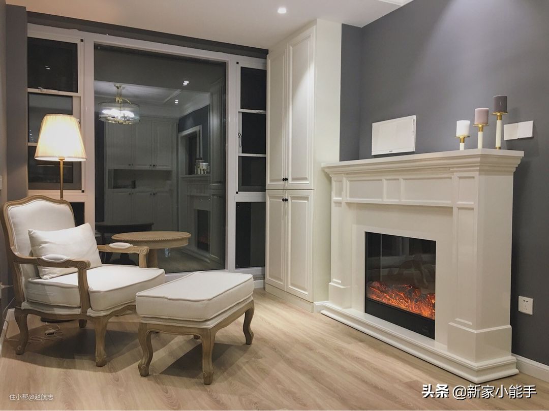 装修偏现代美式风格,一进屋看到这样的入户花园就很喜欢了,空间足够大,以后搬新家入住了,可以在这边区域与家人聊天或者喝茶,看看书或者玩玩手机,都是蛮不错的选择。布置了有个壁炉做装饰,显得比较个性,很漂亮。左侧打了一个储物柜,可以提供更充足的储物空间,加上大大的落地窗,采光特别充足。