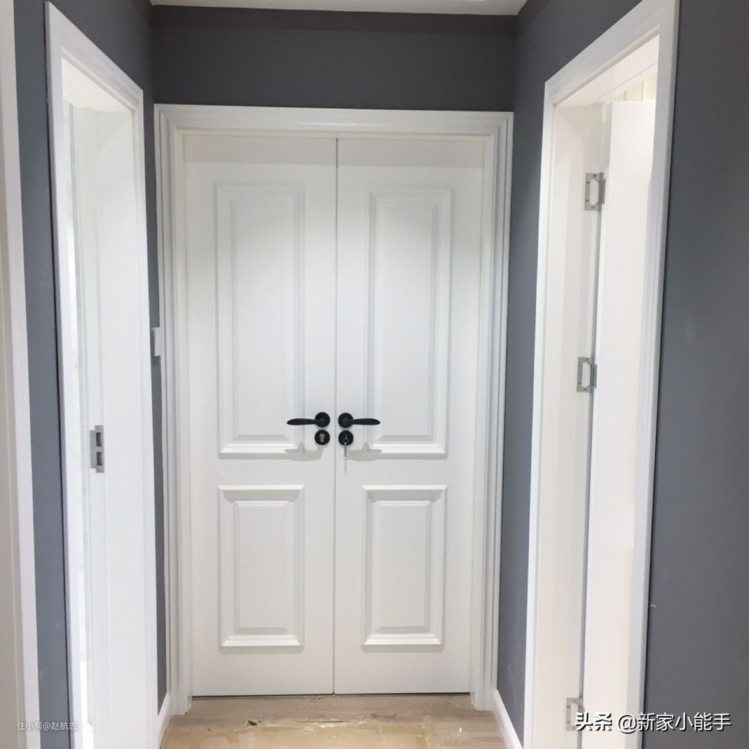 这是过道,室内门都是安装白色的,可以看到主卧安装了非常漂亮的,显得很大气的双开门,搭配黑色的拉手,效果非常抢眼。
