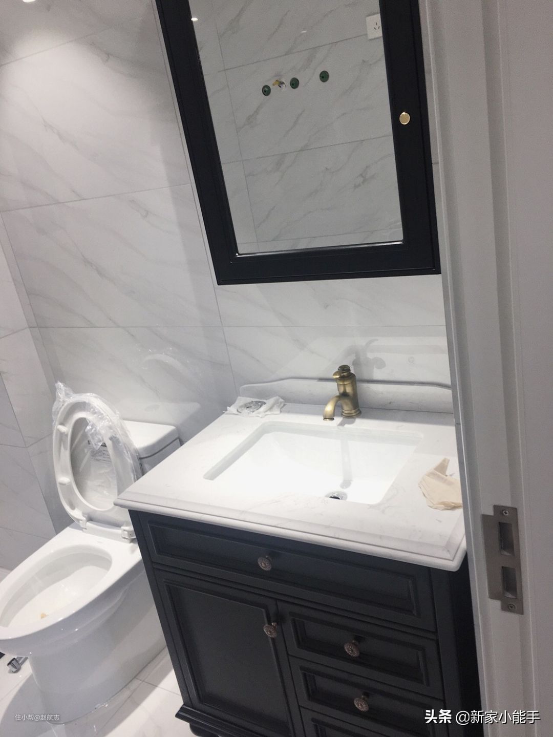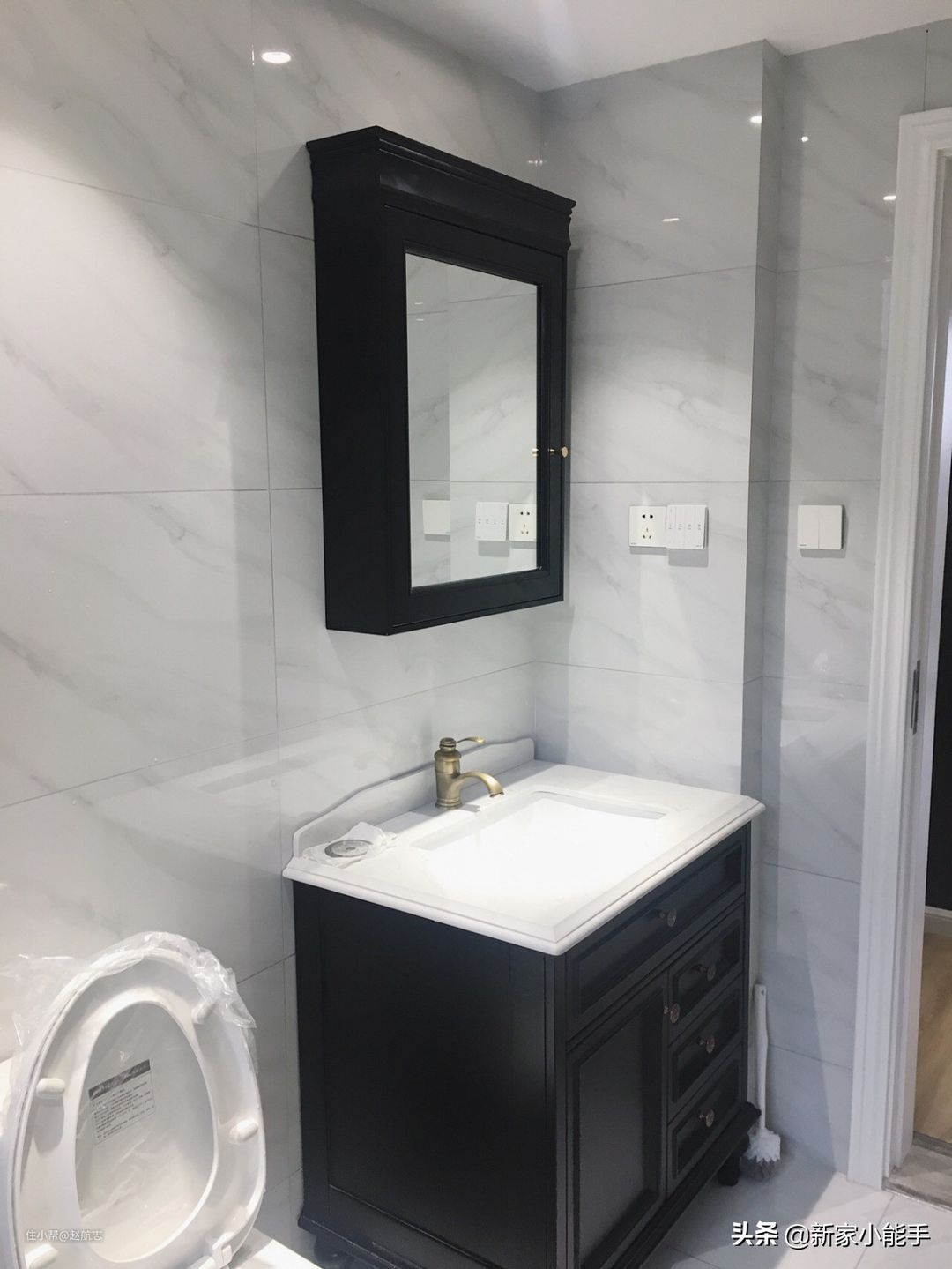 考虑到实用性,安装了柜式镜子,牙膏牙刷都可以很方便收纳起来。