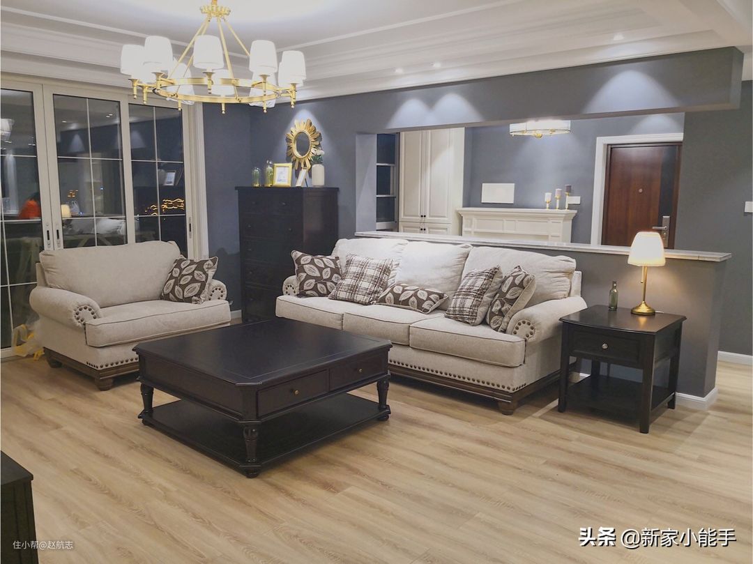 入户花园和客厅是打通的,可以看到沙发后面就是我们刚才所看到的区域了,使得整个空间面积都变大了很多。楼层不是很高,做了吊顶显得低了一些,不过安装了吊顶,显得很大气,很有空间感。沙发茶几的款式都还不错,坐着很舒服,中间黑色的茶几,可以提供蛮不错的储物空间。所有的家具进场就很漂亮,目前还没有入住,里里外外全都打扫干干净净先晾着通风中,过段时间就可以入住了,一家人都很期待。