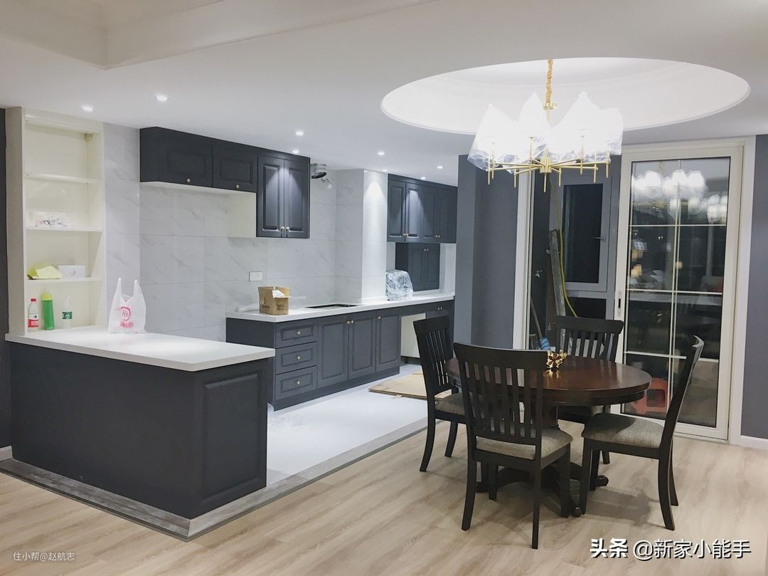 餐厅和厨房其实是在同一个空间,做了开放式的厨房,显得比较时尚,特别喜欢这样的厨房。做了开放式的厨房,显得空间很大。定制蓝色的橱柜,预留了可以放冰箱的位置,以后搬新家入住了,使用很方便。布局比较合理,也考虑到做保洁方便,安装的橱柜都比较耐脏。开放式的厨房很多人都担心油烟处理问题了,这点其实没有必要担心哈。