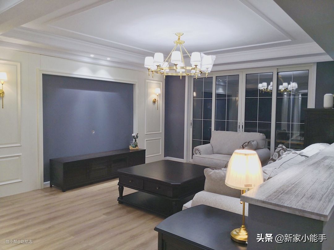 客厅另外一个角度,可以看到比较经典的电视背景墙了,中间蓝色,边框做的是护墙板,刷了白色,搭配起来非常漂亮,而且显得也比较大气,很有档次感。电视墙两边都安装了壁灯,晚上可以增加二次照明,效果显得比较好看。顶面虽然做了吊顶,但是屋主很聪明,放弃了不实用的灯带,觉得还不错哈。推拉门后面有一个蛮大的阳台,不过没有单独拍出来。屋主家里装出的效果,每个空间都很喜欢,很值得做参考。
