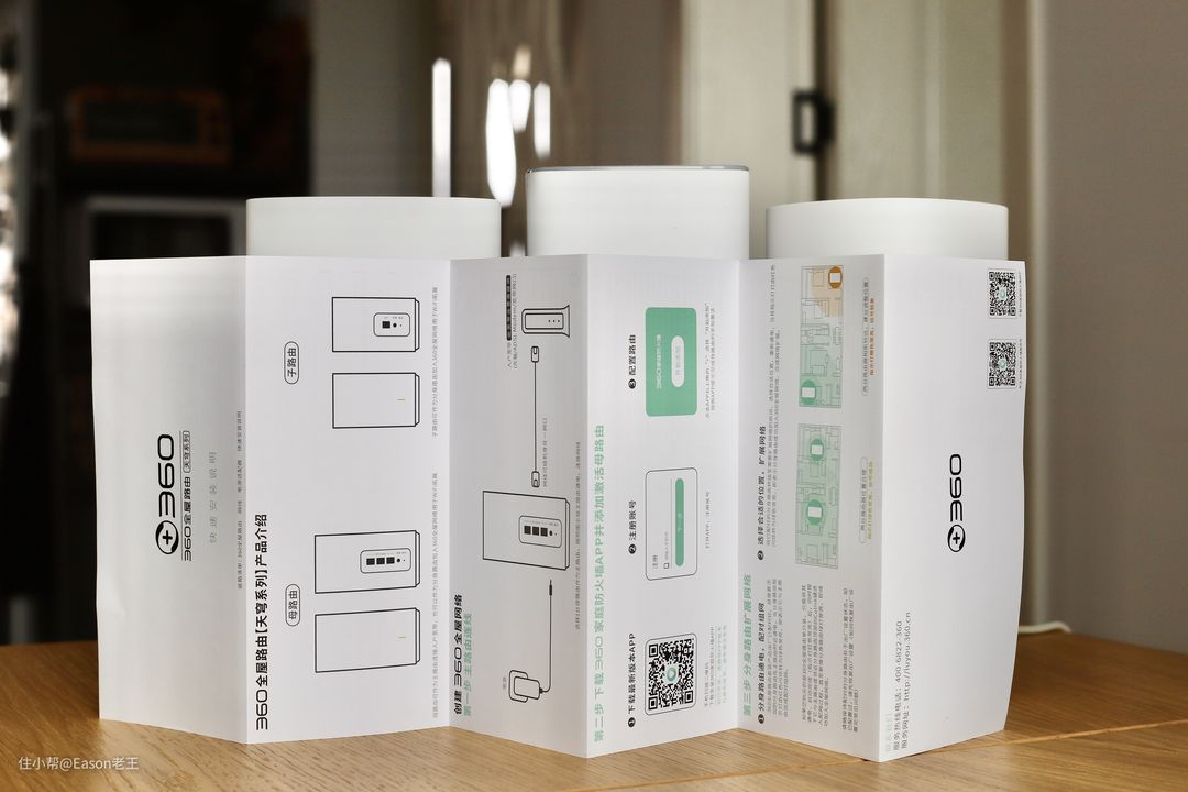 分路由的设置也轻松,按照说明书上来说,360全屋路由套装产品出厂已配对好,我需要做的只是把它放到主路由旁边,然后通上电,等着分路由自己设置完成即可。设置完成会变绿灯,看一眼就知道状态了,非常轻松。